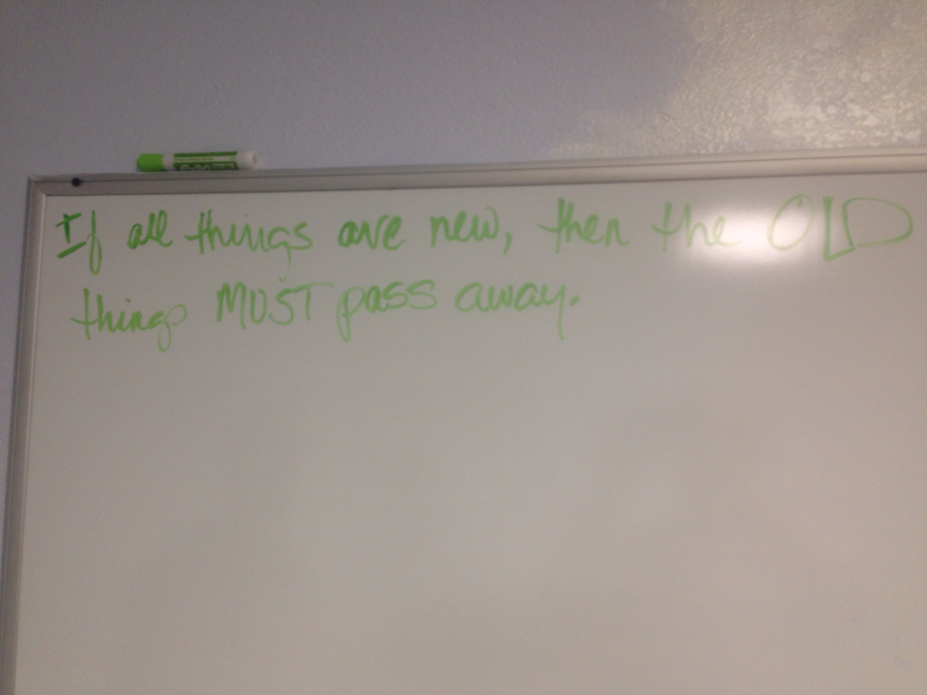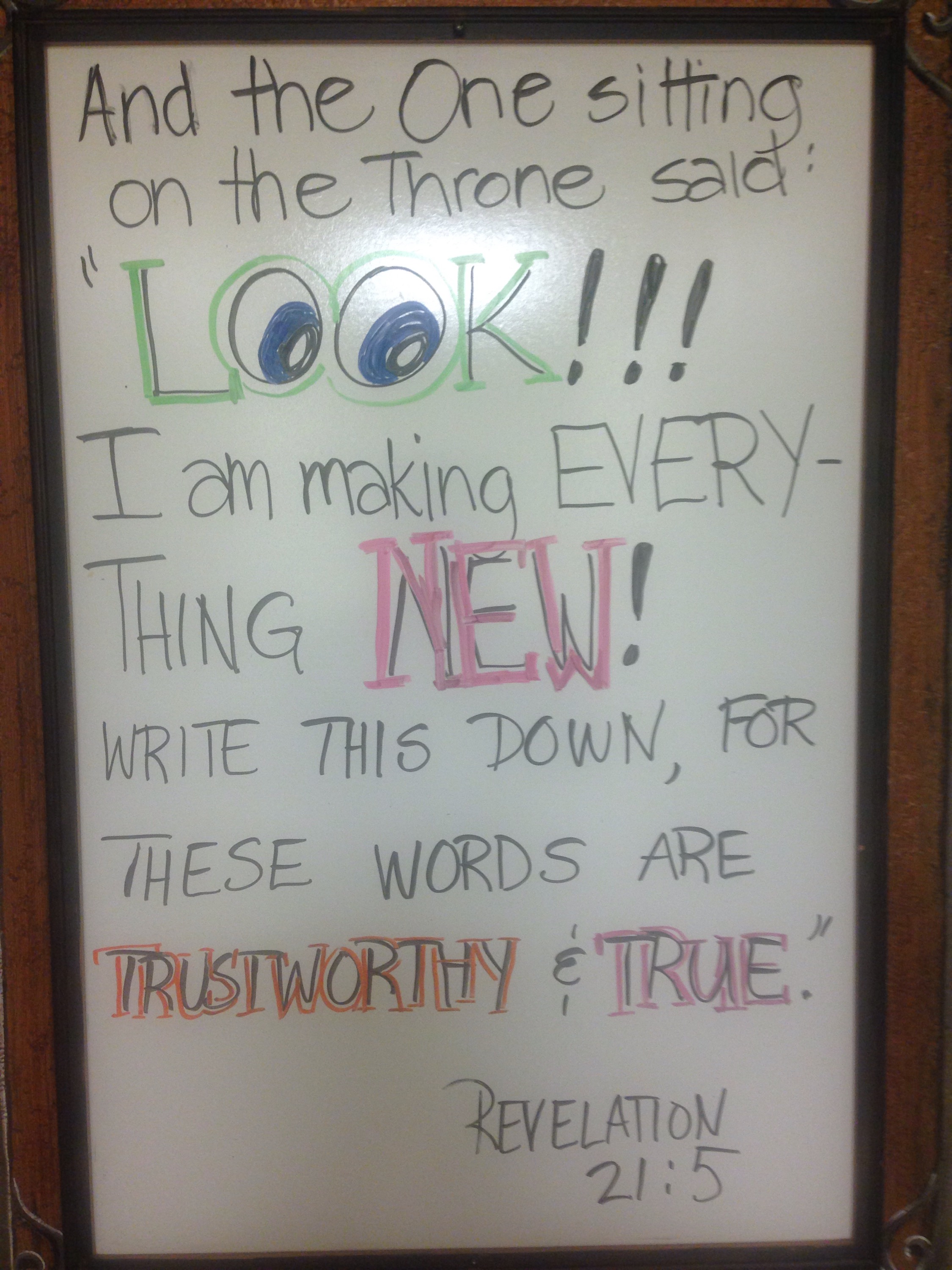 I was thinking about the mistakes I had made in the fight. The words I have spoken that were from a place other than God. I thought about my actions that were not part of His battle plans but my own. He said He even has that covered. God has my back as well as my future. He said He makes ALL THINGS NEW! I was given that word this last Wednesday then yesterday went to look at the room and look what was outside my room and as well written in the Comm room.